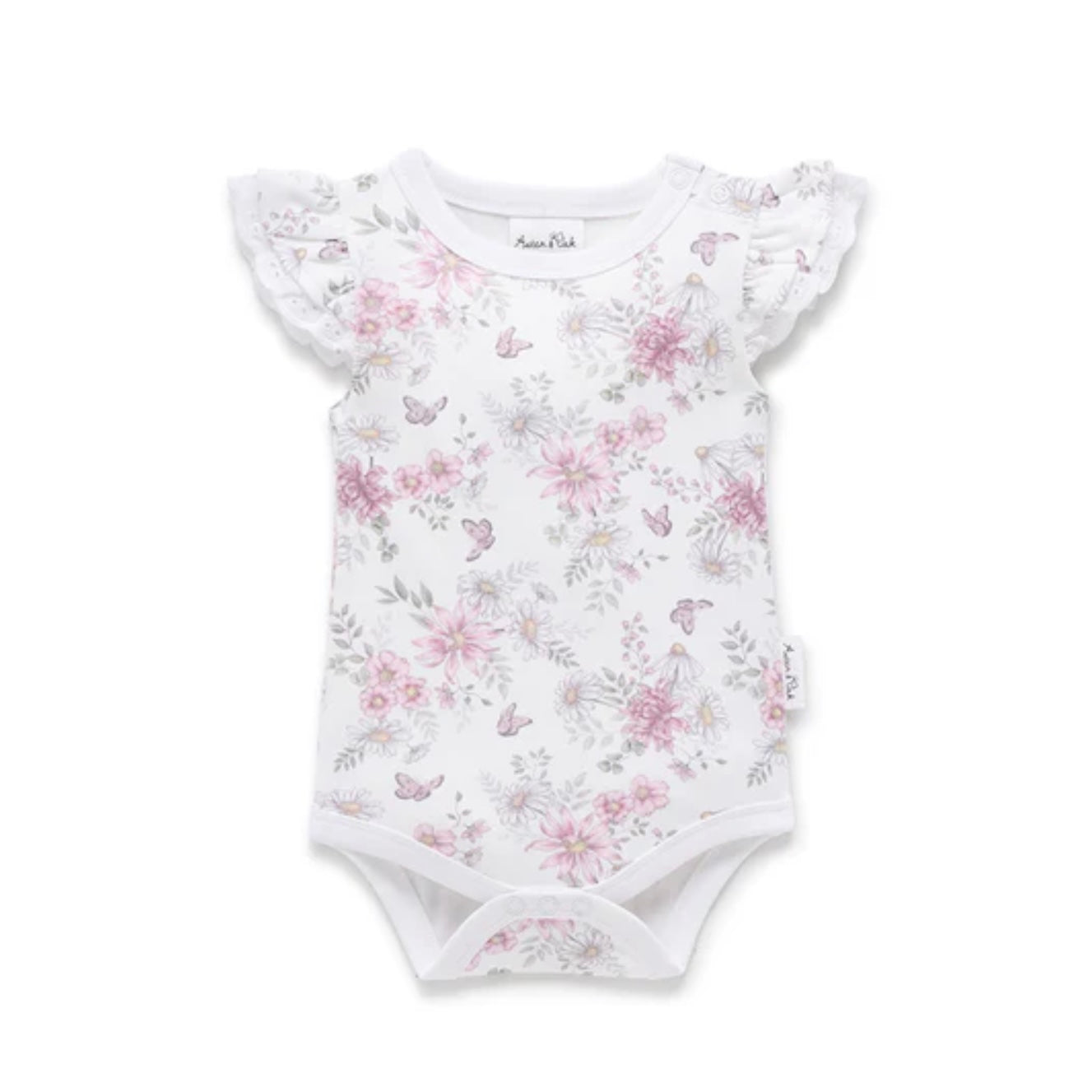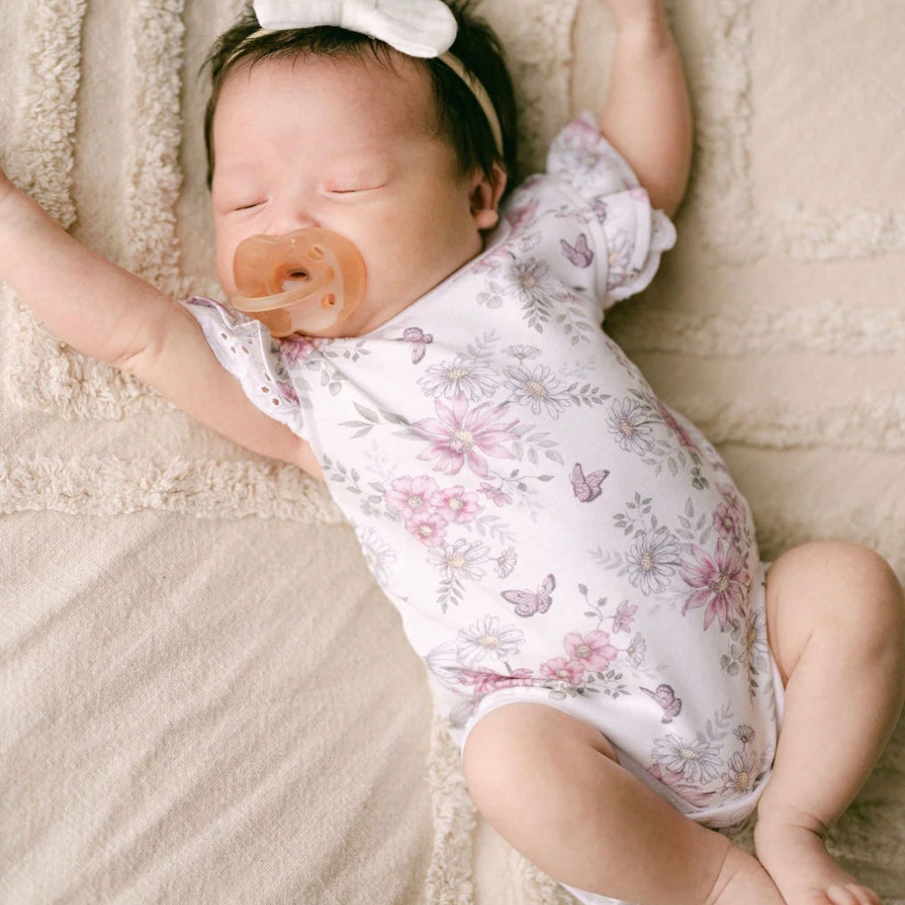 Beautifully designed with flutter sleeves, this all-in-one suit features premium snap closures to gusset and shoulder making changing a breeze. Pair with our matching headband for a cute finish.