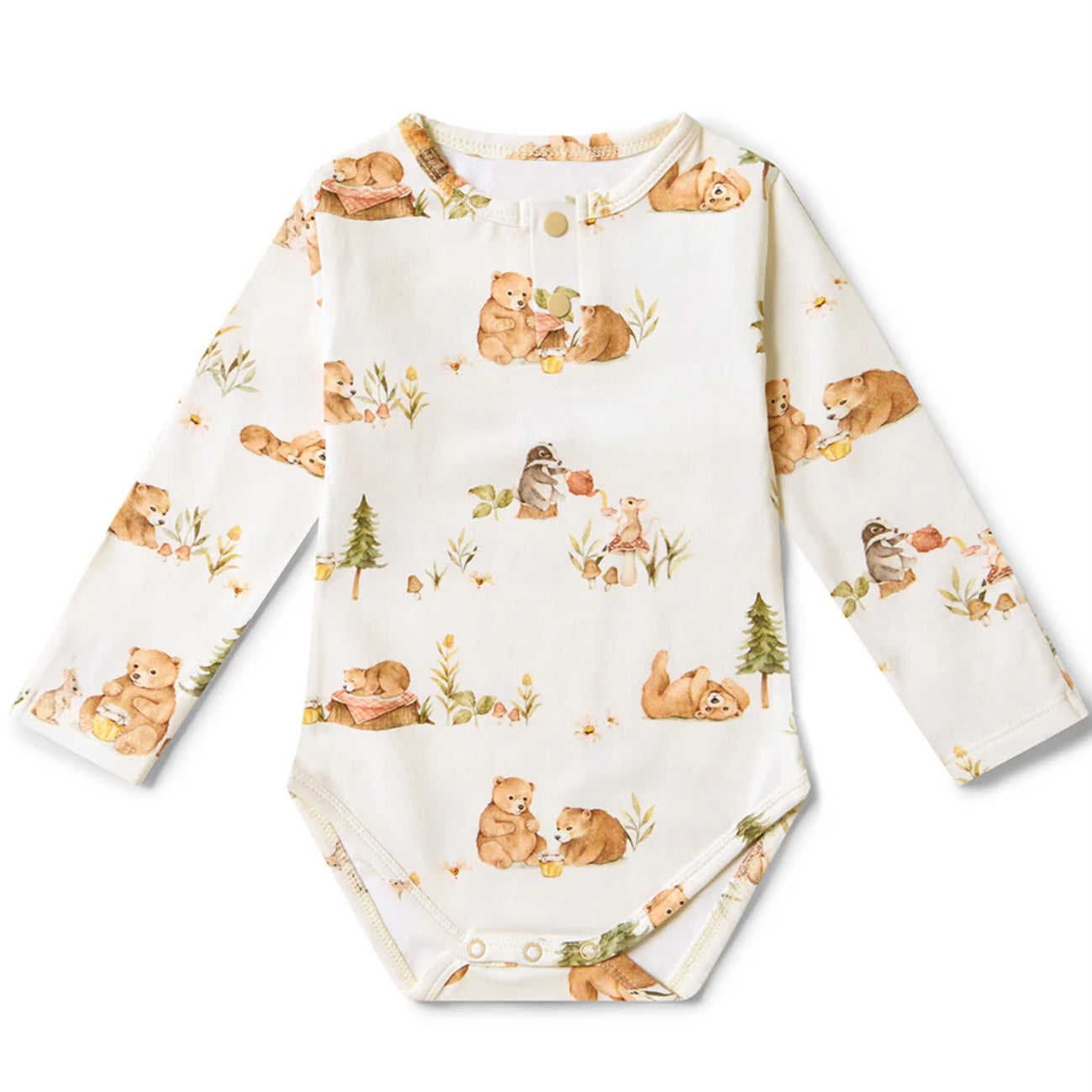 Snuggle Hunny organic bodysuits are made for babies and toddlers. This bodysuit is long-sleeved, and great for cooler days in Summer and Winter under layers. In our Bears print.