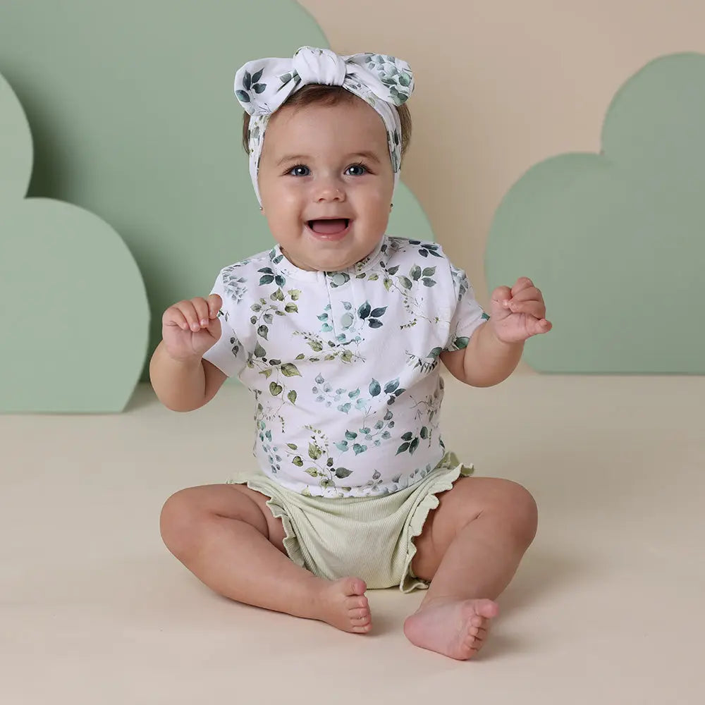 Soft and stretchy, our bodysuits are easy-care and coordinate well with our pants and shorts. Our bodysuits are also really comfortable to sleep in. All Snuggle Hunny clothing is made with GOTS Certified Organic Cotton CU 1182228. Eden is part of our Enchanted Forest Collection. Features Include: * Exclusive Eden print * Sizing: Newborn to Size 2 * Soft and stretchy * Short Sleeve * Fitted style * Easy to wear * Lightweight and breathable * GOTS Certified Organic CU 1182228 * 95% Organic Cotton / 5% Elastane Designed in Australia. Made in India. Note: headwear and accessories not included but can be bought separately. Always remove headwear when putting baby to sleep; no accessories, toys or headwear should be in baby's sleeping space.