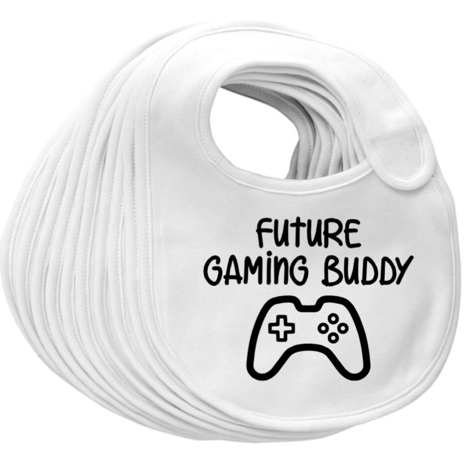 Our “Future Gaming Buddy” Bib is perfect for your Little Gamer 🕹 and is also Available in a matching Onesie!
