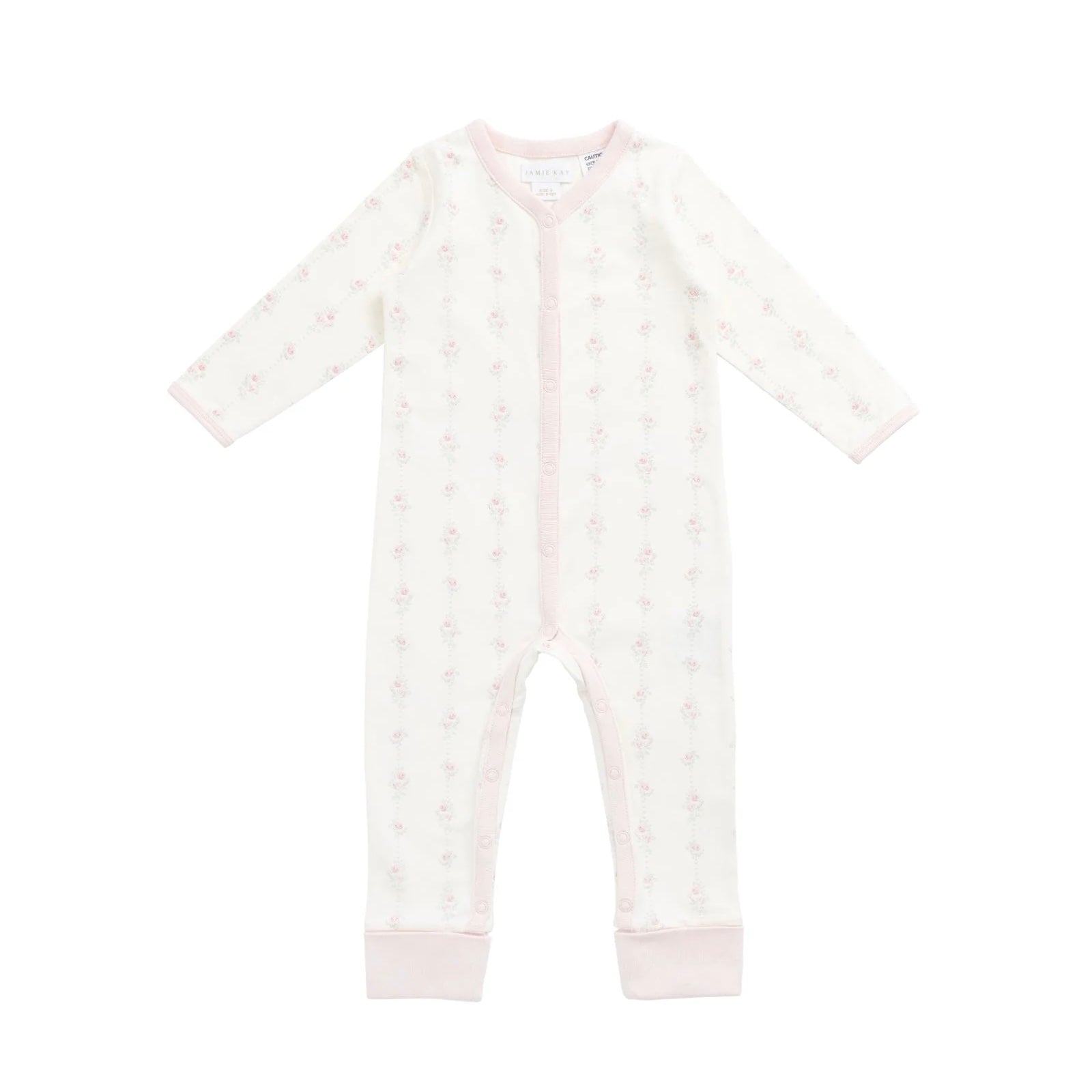 A sweet and practical essential for your little one, the Amory Onepiece in Rose Trail is crafted from a soft blend of 95% organic cotton and 5% spandex, offering gentle stretch and breathable comfort. This charming onepiece features a white base adorned with rose illustrations. Designed with long sleeves and legs, it includes snap domes down the front and along the legs for easy changing and all-day wear.