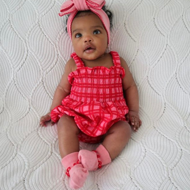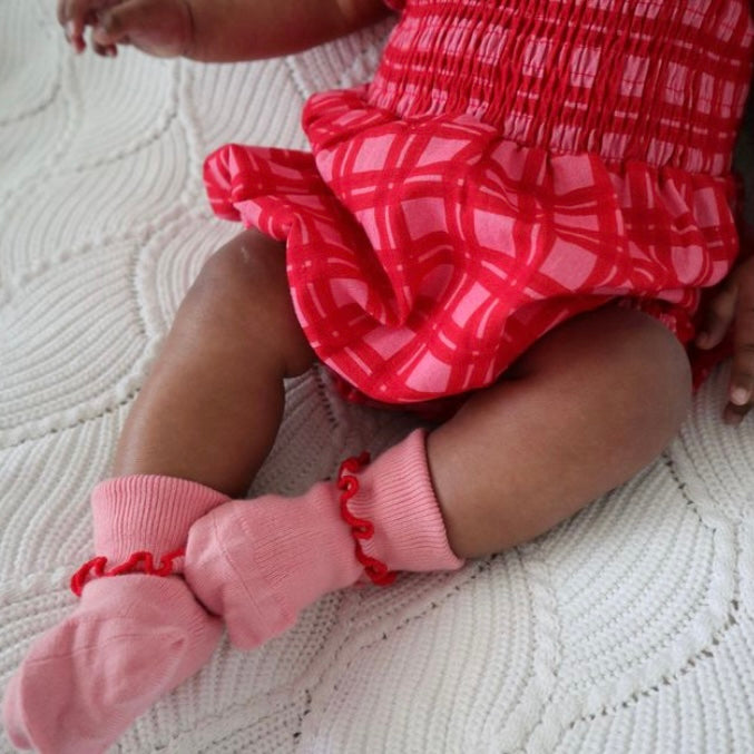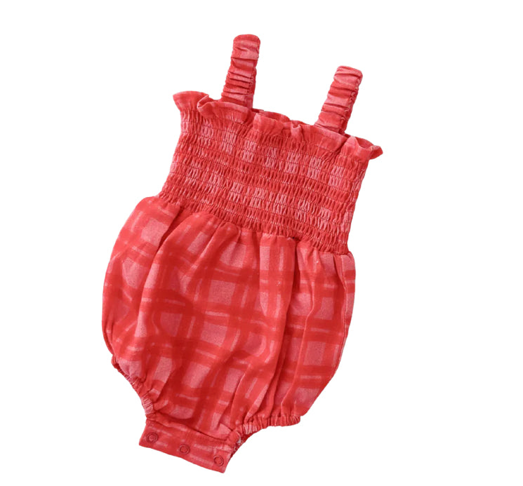 A lightweight cotton romper featuring our exclusive Jolie print. Shirred detailing across the bodice with adjustable button straps at back and snaps at the crotch for easy on/off and nappy changes. Mix and match with items from our Christmas Collection.