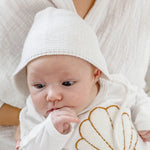 The sweetest knitted bonnet for a newborn baby made from the softest cotton in a neutral white color. This bonnet makes for a beautiful baby shower gift for a loved one or for your own baby. These have been designed to fit 'new' babies and as a special keepsake to be worn home from hospital, therefore sizing is suitable for age Newborn - 5 weeks old Remove headwear while your baby is sleeping or in the car, adult supervision required. * Matching booties available * Available in 3 colors (Mocha, White and Oat) * Model pictured is 5 weeks old * 100% Cotton
